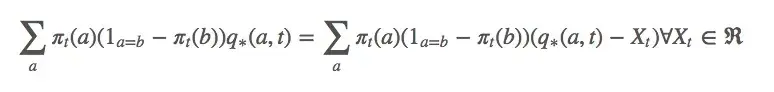 因为 q_∗(a,t) 被包含在动作a的预期值内,它也可以被写成 R_t 。现在就只剩一个问题了:等式里的 X_t 是什么?坦率地说,你想它是什么它就是什么,严谨起见,我们可以把 X_t 当成 R_t 的平均值。