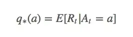 设在第 t 次拉下拉杆时,我们采取的动作是 A_t ,当时获得的回报是 R_t 。那么对于任意动作 a ,它的动作值(value) q_∗(a) 是: