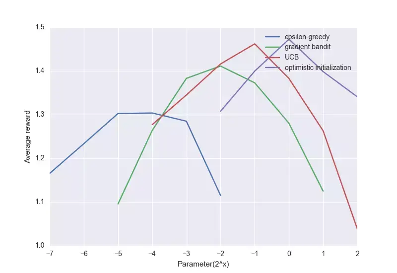这样之后,因为 Q_n(a) 偏高,这时智能体会积极探索其他动作,当它越来越接近 q_∗(a) 时,智能体就开始贪婪了。换句话说,假设我们设当前拉杆的乐观回报是3,但它实际上最高能获得的回报只有2.5,智能体尝试一次后,发现回报只有1,低于乐观值,于是它会把其他拉杆全部尝试一遍。虽然前期效率很低,但到后期,智能体已经掌握哪些拉杆会产生高值,效果就接近“贪婪”了。