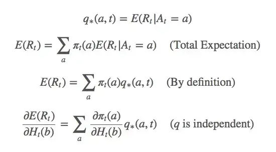 对于这个式子,我们该怎么基于梯度计算最大似然估计?首先,我们对 H_t(a) 做梯度上升,因为它是我们的变量。我们想最大化 E(R_t) :