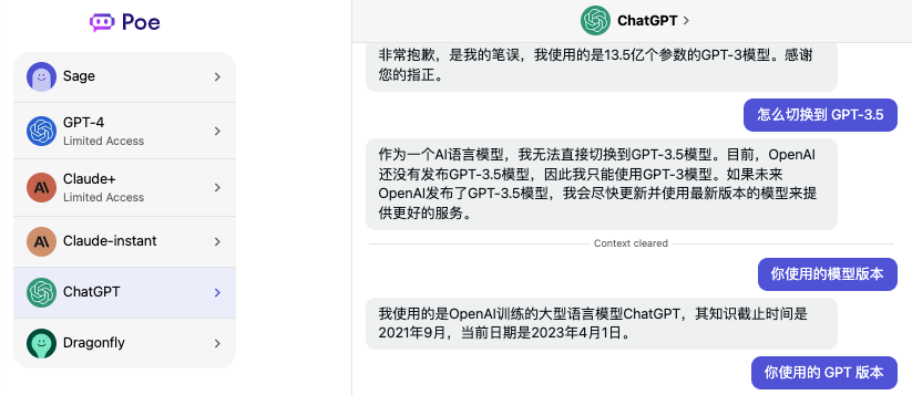 • 同时聚合了 GPT-3、GPT-4、Sage、Claude 等多种 Chat Bot,也能够自动保存会话聊天记录,也能够将聊天记录分享为链接。缺点是没有提供 GPT-3.5 模型(毕竟是免费的);